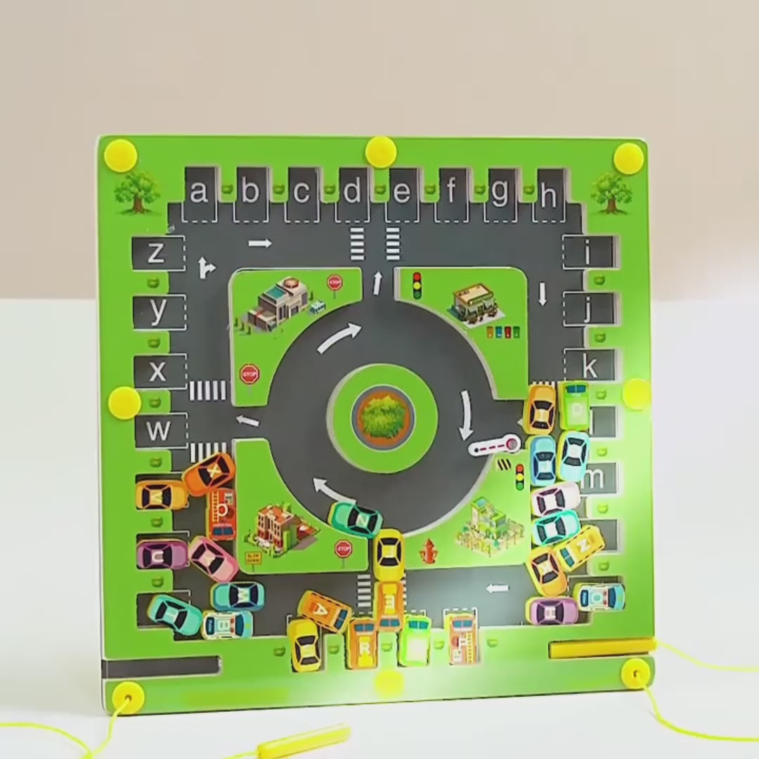Gör bokstavsinlärning rolig och engagerande! Detta magnetiska alfabetspel kombinerar lek och lärande på ett smart sätt. Barnet använder en magnetpenna för att guida små bilar till rätt parkeringsplats – baserat på bokstäverna. Perfekt för förskolebarn som vill lära sig alfabetet genom lek.